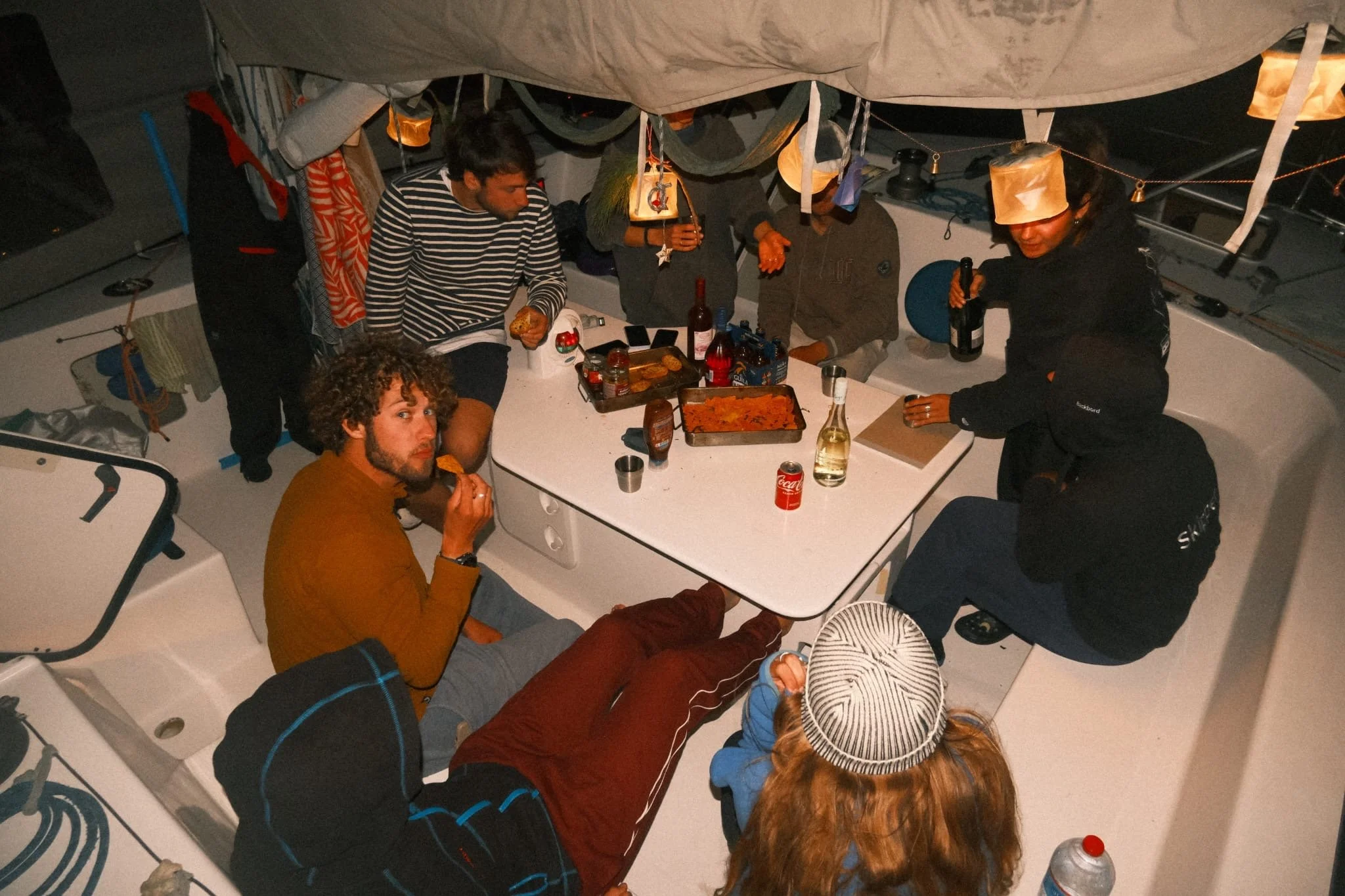 Die ersten Tage der Überfahrt verlaufen sehr angenehm. Wir sind mittlerweile in den neuen Crews angekommen und fühlen uns wohl in der gemeinsamen Routine. Auf Solea läuft ein Tag und eine Nacht in etwa folgendermassen ab: Obwohl wir etwas gestaffelt aufstehen, sind meistens alle pünktlich zum Zmorgen-Avocado-Ei-Super-Toast auf Deck. Anschliessend verbringen wir dann 1-2 Stunden zusammen im Cockpit. Wir studieren an Kreuzworträtseln und hören Musik. Wenn der Wind schön von hinten kommt und die Bedingungen somit eher ruhig sind, rollen wir zwischendurch unsere Yogamatten aus. Wir kochen viel, manchmal einfach und zwischendurch auch spektakulär. Meistens wird es dann bereits wieder dunkel und wir entscheiden, wer welche Nachtschicht macht. Wir lassen uns vom Schaukeln des Schiffs in den Schlaf wiegen und versuchen uns von der zunehmenden Feuchtigkeit, die sich schnell in den Rümpfen bildet nicht stören zu lassen. Wenn wir mitten in der Nacht geweckt werden, stehen wir tapfer für unsere Schicht auf. Wir trinken viel Tee, betrachten die Sterne und halten zwischendurch via Funk ein Schwätzchen mit der Planado-Crew. Seit neustem behalten wir immer unsere Kapuzen oben, denn seit Gibraltar werden wir regelmässig von fliegenden Fischen überrascht. Sie verirren sich im Flug auf unser Schiff, oder eben auch in Léonies Nacken. Deshalb die Kapuzen.