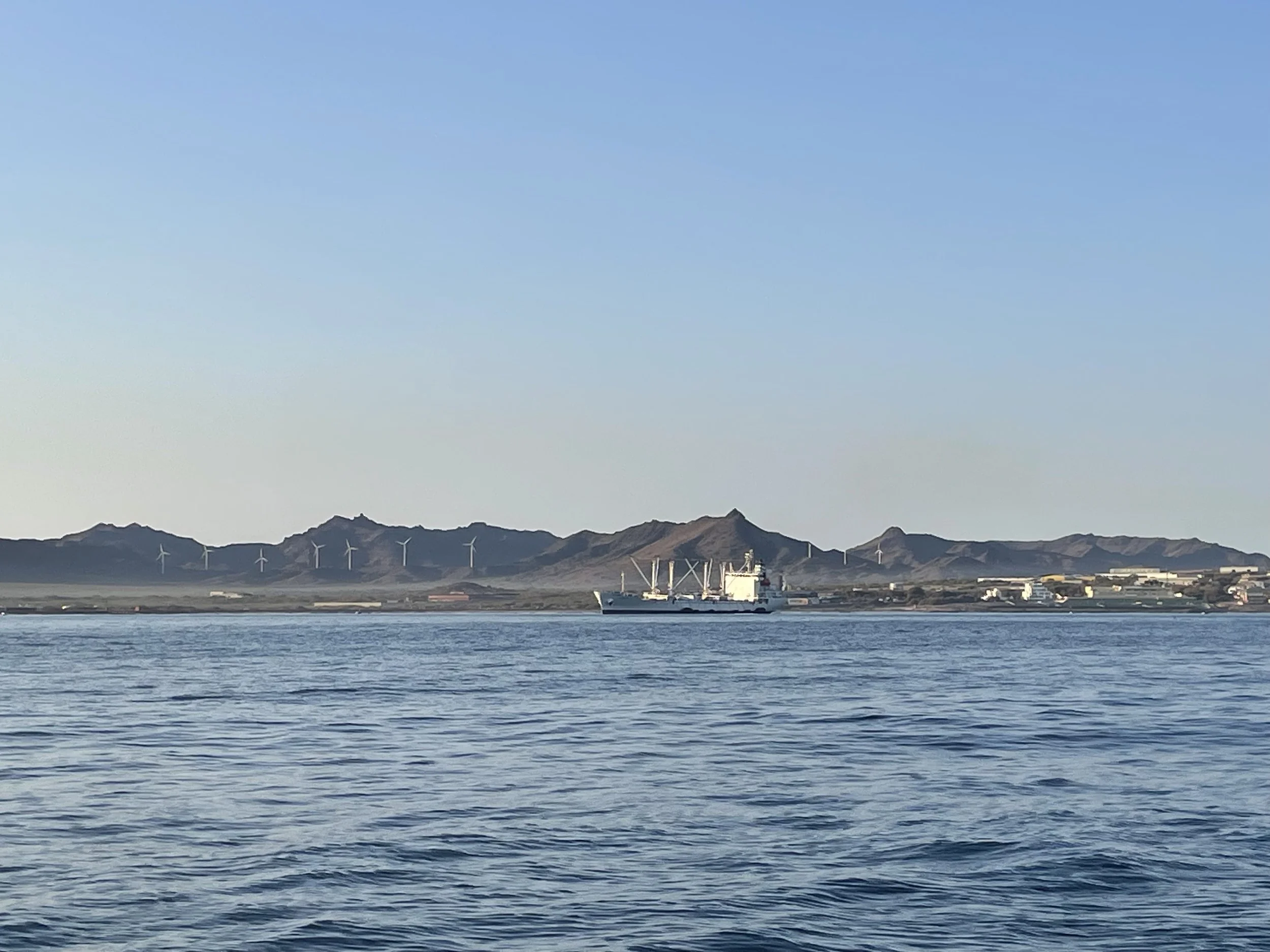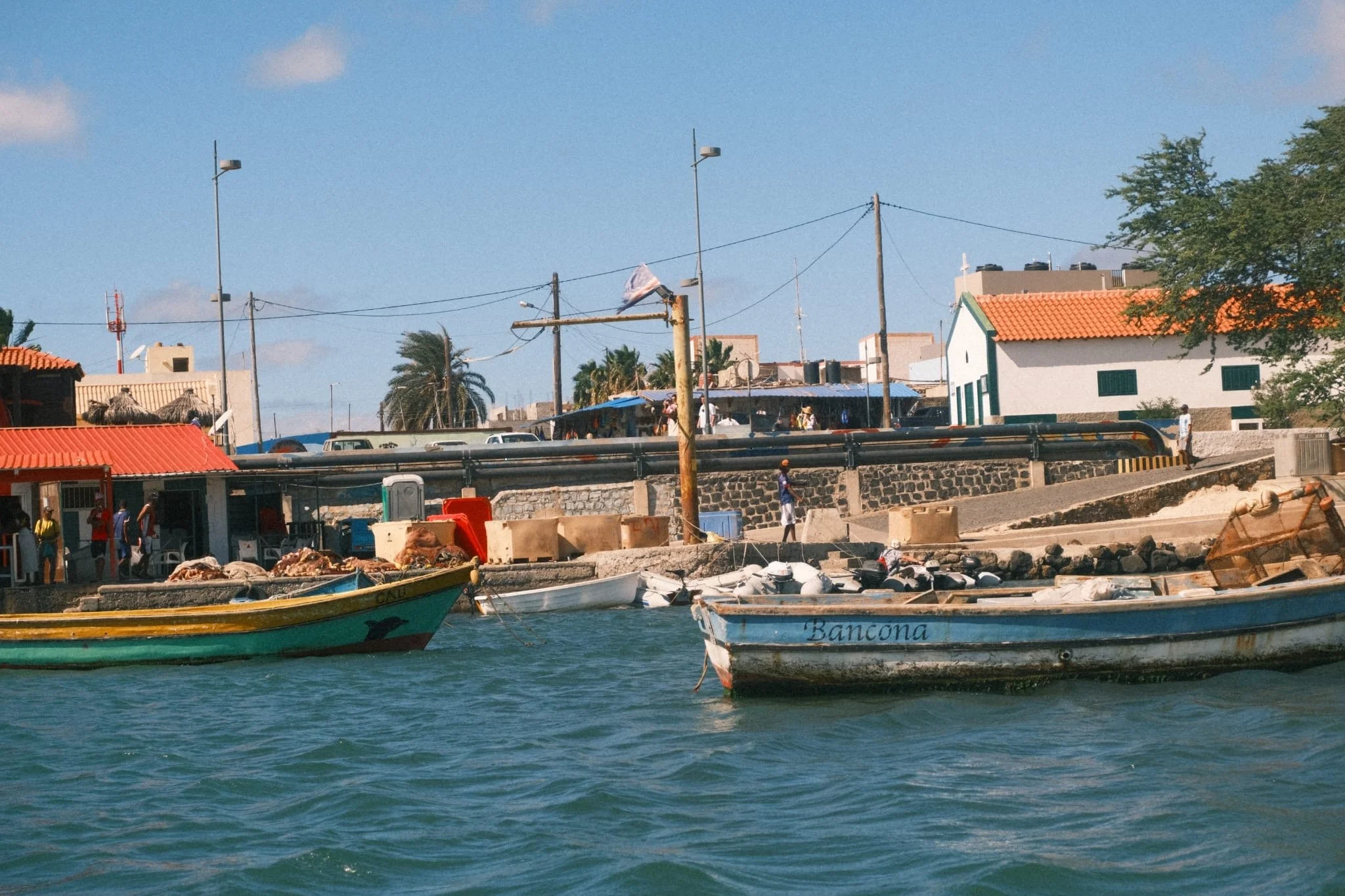 Sal, Kap Verde. Nicht viel grün, erstmal eher karges Land, dafür umso buntere Häuser erwarten uns auf dem Festland. Ehrlicherweise haben wir in Palmeira einen Hafen erwartet, es stellt sich jedoch heraus, dass es hier gar keinen Hafen, so wie wir ihn kennen, gibt. Wir ankern mit vielen weiteren Schiffen in der Bucht vor der kleinen Stadt. Dass es keinen Hafen gibt, bedeutet für uns kein frisches Wasser, um die Schiffe und Segelkleider vom Salz zu befreien, kein frisches Wasser für unsere Wassertanks, mit dem wir vor allem Geschirr und Hände waschen und keinen Strom, um unsere Bordbatterie zu laden. Zum Glück sind Tanks und Batterien noch halb voll und wir können noch ein bis zwei Wochen ohne nötige Infrastruktur weiterreisen. Unsere To-Do-Liste ist dieses Mal kleiner als nach anderen Überfahrten und wir sind sehr froh drum. Wir merken schnell, dass wir hier für alles mehr Zeit benötigen. Mit einem Mix aus Französisch, Spanisch und Englisch finden wir von Zeit zu Zeit heraus, wo wir unseren Müll entsorgen können, wann der kleine Lebensmittelladen geöffnet ist und wo wir einklarieren können. Die Menschen sind sehr freundlich und helfen uns gerne bei allem Möglichen. Auch sonst verändern sich ein paar Dinge. Die meisten von uns haben nun kein Internet mehr und wir müssen uns extrem gut absprechen wie wir uns beispielsweise für ein gemeinsames Znacht an Land wieder treffen.