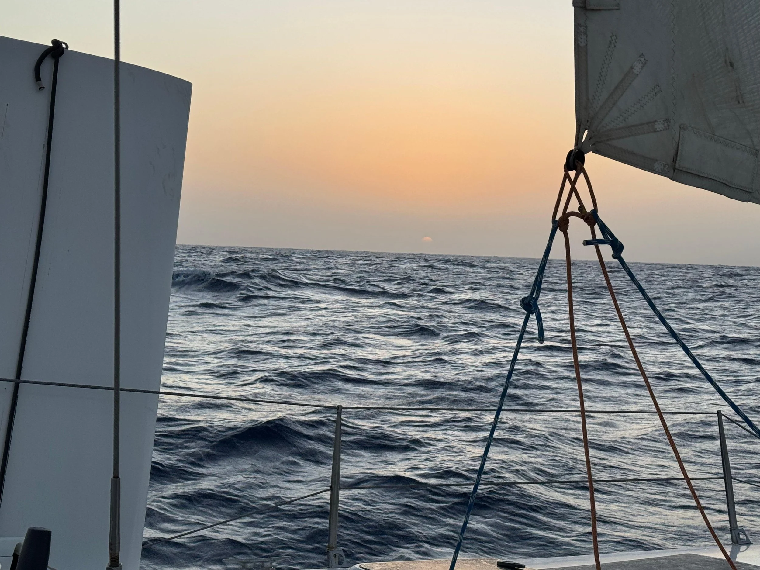 Heute ist der Tag, an dem auf Solea das WC-Papier ausgeht. Sie segeln nicht weit vor uns, die Fock eingerollt, damit wir aufholen können. Wir segeln vorsichtig von hinten an ihre Backbordseite und schmeissen ihnen eine Packung WC-Papier ins Cockpit. Wir sind alle an Deck, um „Hallo“ zu sagen. Für einen kurzen Augenblick sind wir so nah, wir können uns fast umarmen, und dann, wenige Minuten später, verschwinden sie hinter den Wellen. Die beiden Welten trennen sich wieder. Wir spielen Wer Bin ich? und erleben einen wunderbaren Sonnenuntergang. Ich sauge ihn nochmal richtig ein. Goldene, goldene Sonnenstrahlen und der weite Horizont. Nach 14 Tagen sehen wir den ersten Tanker.