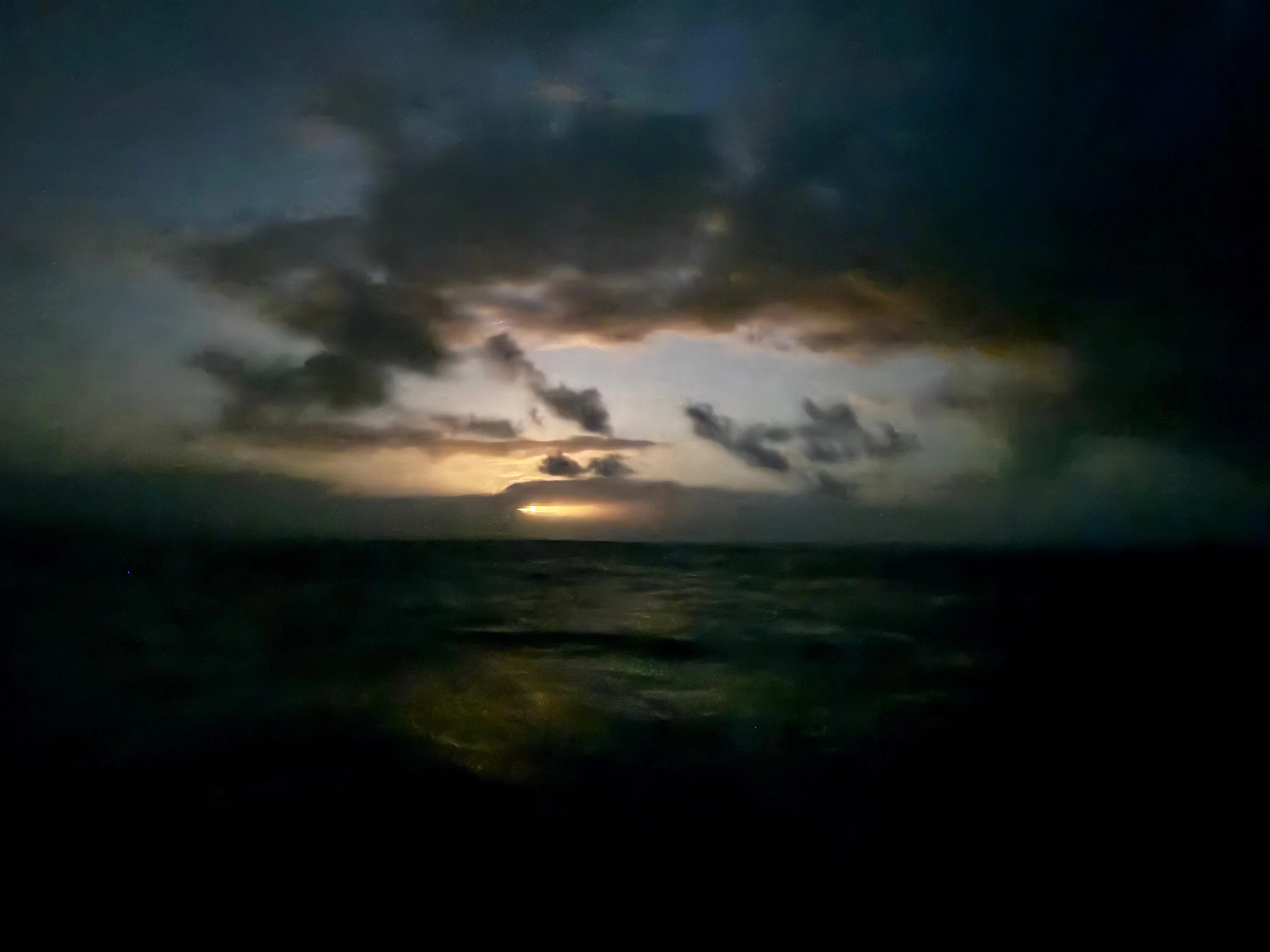 Morgen erwarten wir unsere Ankunft. Das bedeutet heute ist bunter Abend! Wir nehmen das sehr ernst und sitzen zum Znacht plötzlich alle im Kostüm im Cockpit. Annso und Flo verkleidet mit allen bunten Tüchern, die sie finden konnten. Noah mit einem grossen Bademantel. Léonie verkleidet als Nici, Nici als Léonie. Ich als Wal. Léonie erheitert uns mit Züridütsch, parodiert Nicis täglichen Blödsinn und Nici kontert mit einem breiten Baseldütsch. Viel schöner hätte unser letzter Abend nicht sein können. Mein Herz ist voll. 128 Seemeilen liegen noch vor uns. Wir freuen uns sehr auf Grenada, könnten alle aber auch noch ein paar Tage weitersegeln. Am Horizont die Lichtverschmutzung von Barbados.