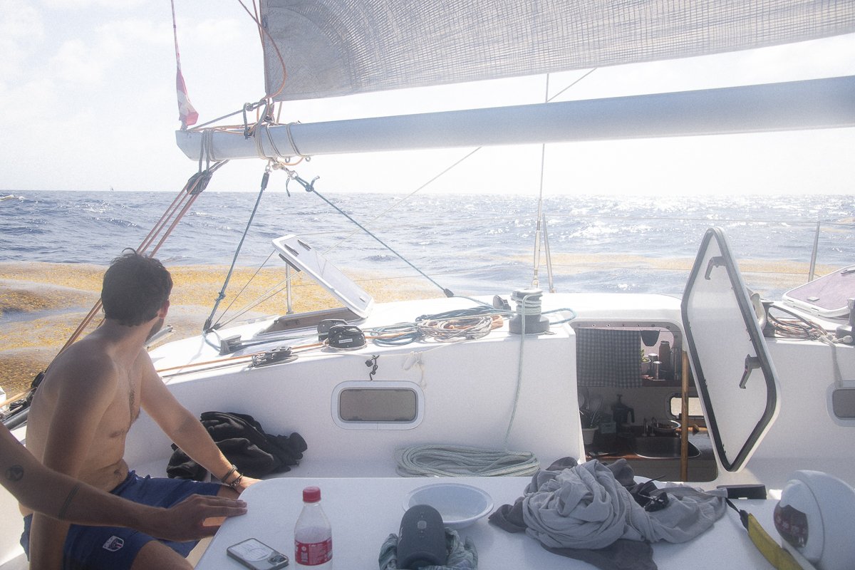 Noch drei Tage. Langsam wiederholt sich alles, Tag für Tag. Wirklich alles. Und es ist fast ein bisschen schwer nicht anzufangen, die Tage herunter zu zählen. Ein Vogel kreist am Morgen sehr lange um unser Schiff. Wir fahren durch riesige Algenfelder, die uns schon seit ein paar Tagen entgegenkommen. Wenn wir in sie hineinfahren, bleiben wir stecken und unser Schiff dreht sich in den Wind. “Heute ist ein guter Tag” ist das heutige Motto, oder eher Mantra. Am Abend gibt es wieder das tägliche Funk-Update mit Planado. Sie erzählen, dass bei ihnen heute der Gennaker zum Einsatz kam. Das bringt noch mal ein anderes Segelfeeling mit sich und das Riesen Segel bietet viel mehr Schatten. Nici und Iuna werden langsam gut im Ourill, ein kap verdisches Spiel aus Holz.