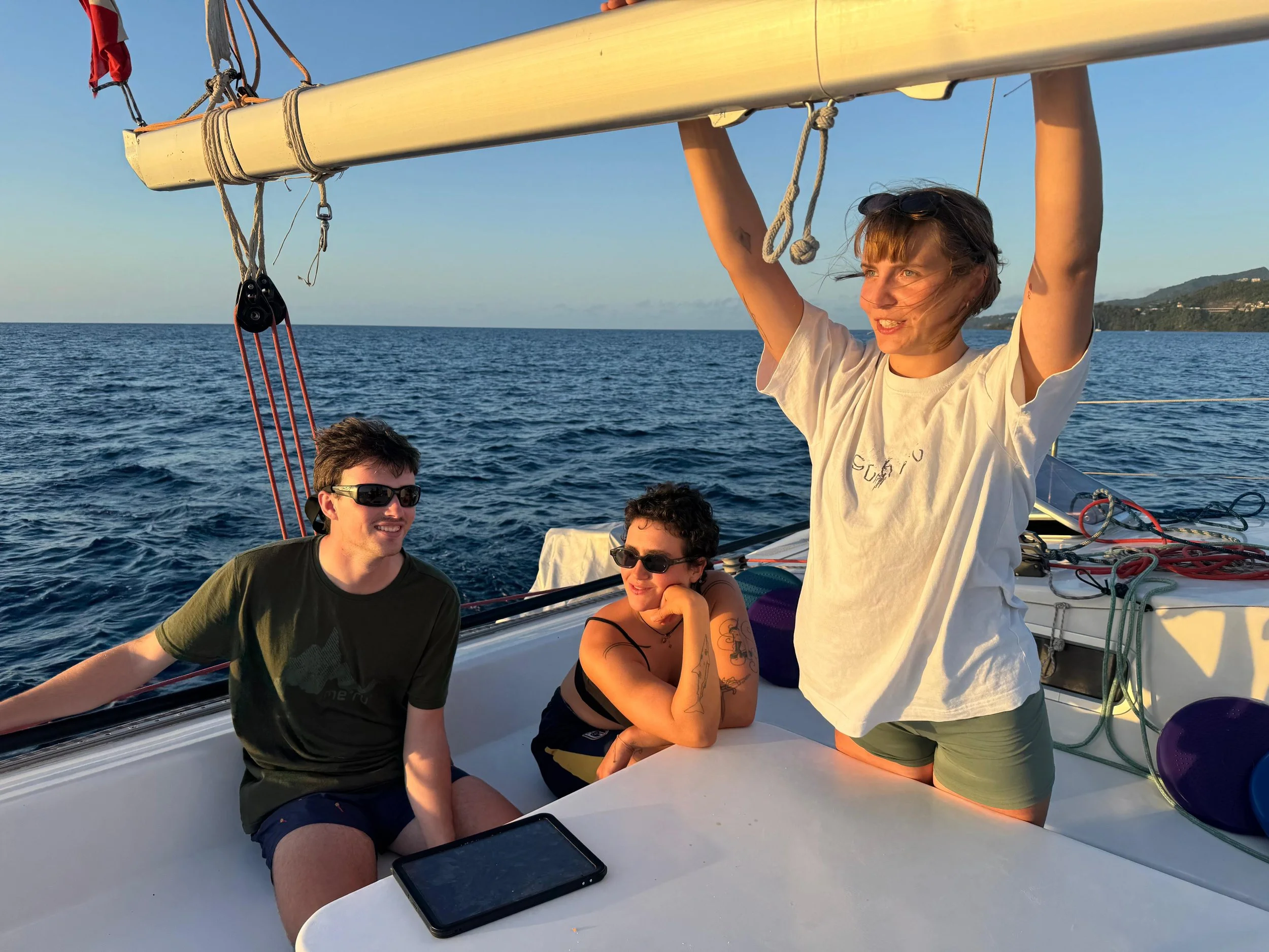 Angekommen. Im Dunkeln. Kurz vor der Hafeneinfahrt geht die Sonne unter. Die Soleaner:innen erwarten uns bereits am Steg mit offenen Armen, helfen uns vom Schiff. Die Freude ist riesig. Die Umarmungen lang und fest. Beine bewegen, das Gefühl ist unglaublich! Ein Handstand. Ein Prosecco der knallt. Warm, wie der noch von der Sonne aufgeheizte Steg unter uns. Wir trinken direkt aus der Flasche, reichen ihn von Mund zu Mund. Wir sind so stolz und so fremd an einem Ort. Wo sind wir gelandet?! Es zwitschern Vögel die uns unbekannt sind. Palmen! Das muss der schönste Hafen sein, in dem wir je waren. Wir setzen uns in einen Kreis und versuchen kurz setzen zu lassen, was wir gerade gemacht haben. Was wir geschafft haben! Wir sind 2300 Seemeilen gesegelt ohne Stop. Das ist dieselbe Distanz wie von Zürich an den Nordpol. Wir sind zusammen um die halbe Welt.